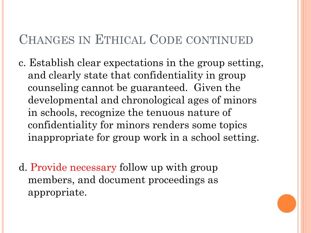 Changes in Ethical Code continued c. Establish clear expectations in the group setting, and clearly state that confidentiality in group counseling cannot be guaranteed. Given the developmental and chronological ages of minors in schools, recognize the tenuous nature of confidentiality for minors renders some topics inappropriate for group work in a school setting. d. Provide necessary follow up with group members, and document proceedings as appropriate.