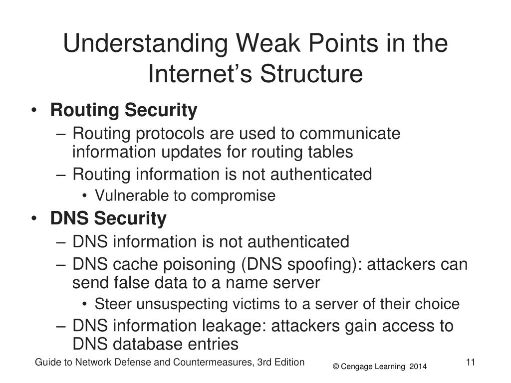 Understanding Weak Points in the Internet’s Structure • Routing Security • Routing protocols are used to communicate information updates for routing tables • Routing information is not authenticated • Vulnerable to compromise • DNS Security • DNS information is not authenticated • DNS cache poisoning (DNS spoofing): attackers can send false data to a name server • Steer unsuspecting victims to a server of their choice • DNS information leakage: attackers gain access to DNS database entries Guide to Network Defense and Countermeasures, 3rd Edition