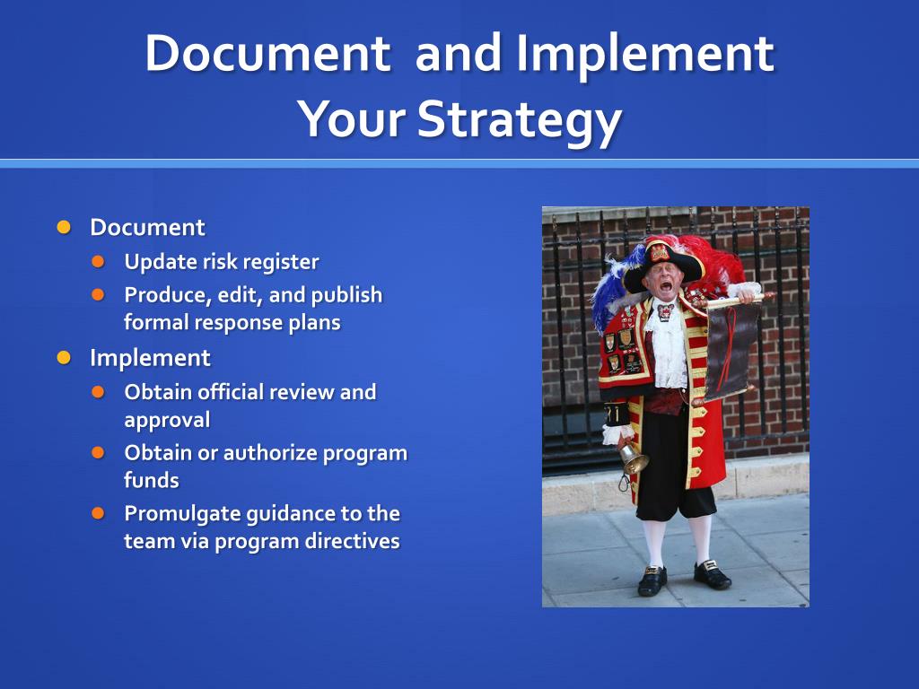 Document and Implement Your Strategy • Document • Update risk register • Produce, edit, and publish formal response plans • Implement • Obtain official review and approval • Obtain or authorize program funds • Promulgate guidance to the team via program directives