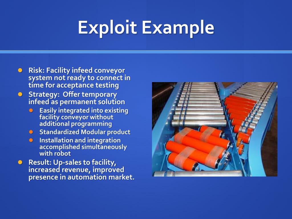 Exploit Example • Risk: Facility infeed conveyor system not ready to connect in time for acceptance testing • Strategy: Offer temporary infeed as permanent solution • Easily integrated into existing facility conveyor without additional programming • Standardized Modular product • Installation and integration accomplished simultaneously with robot • Result: Up-sales to facility, increased revenue, improved presence in automation market.