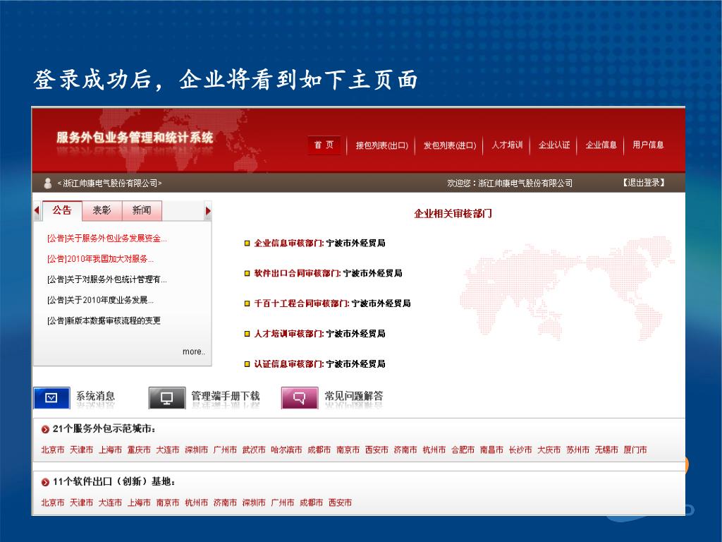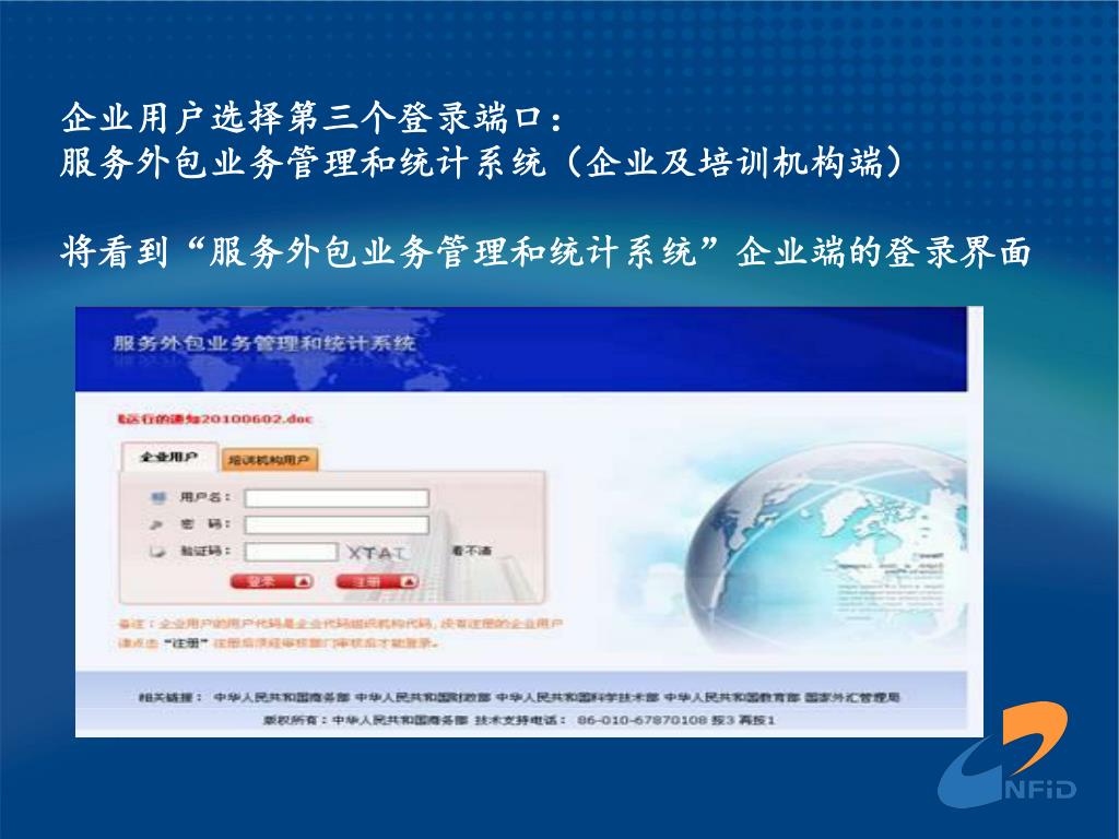 服务外包统计系统操作 及业务认定实务 宁波市外经贸局 林 洁 2010 年 9 月. 服务外包业务管理和统计系统 (企业端 )操作. 一、企业基本信息注册 二、企业合同上报 三、企业合同执行情况添加 四、企业人才培训情况添加 五、企业认证情况添加. 一、企业基本信息注册 企业用户首先打开 IE 浏览器,在地址栏中输入: http://www.fwwb.gov.cn/ 将看到如下服务外包业务管理和统计系统的登录界面. 企业用户选择第三个登录端口: 服务外包业务管理和统计系统(企业及培训机构端) 将看到 “ 服务外包业务管理和统计系统 ” 企业端的登录界面.