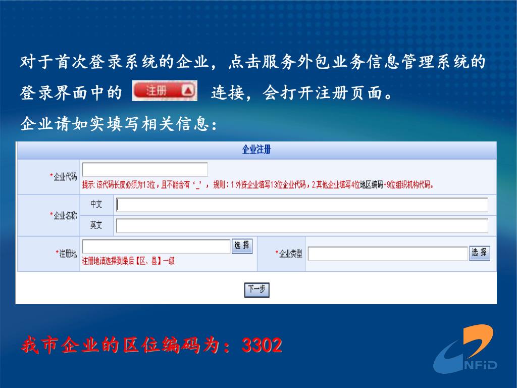 对于首次登录系统的企业,点击服务外包业务信息管理系统的对于首次登录系统的企业,点击服务外包业务信息管理系统的 登录界面中的 连接,会打开注册页面。 企业请如实填写相关信息: 我市企业的区位编码为:3302