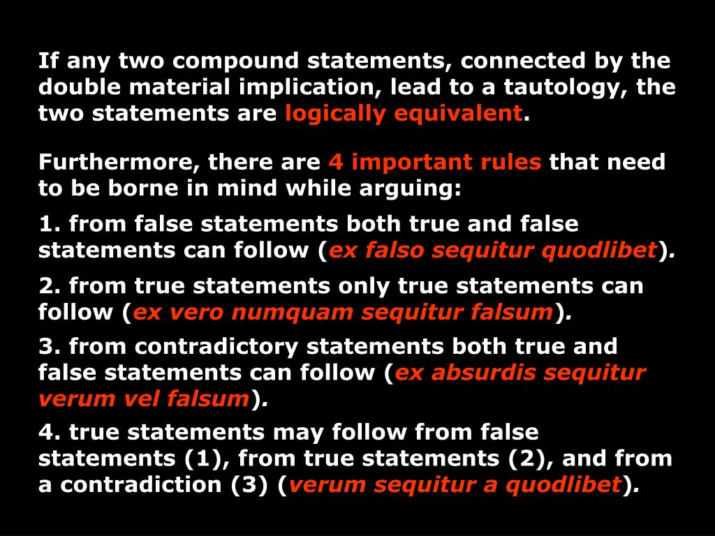 If any two compound statements, connected by the double material implication, lead to a tautology, the two statements are logically equivalent. Furthermore, there are 4 importantrules that need to be borne in mind while arguing: 1. from false statements both true and false statements can follow (ex falso sequitur quodlibet). 2. from true statements only true statements can follow (ex vero numquam sequitur falsum). 3. from contradictory statements both true and false statements can follow (ex absurdis sequitur verum vel falsum). 4. true statements may follow from false statements (1), from true statements (2), and from a contradiction (3) (verum sequitur a quodlibet).