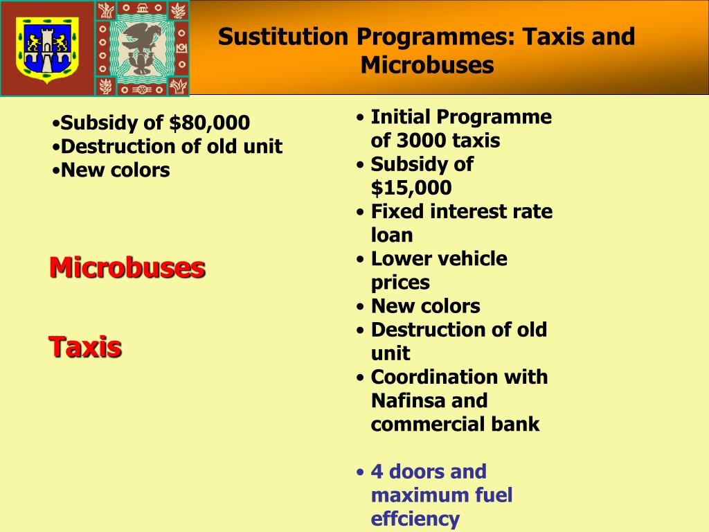 Sustitution Programmes: Taxis and Microbuses • Initial Programme of 3000 taxis • Subsidy of $15,000 • Fixed interest rate loan • Lower vehicle prices • New colors • Destruction of old unit • Coordination with Nafinsa and commercial bank • 4 doors and maximum fuel effciency • Subsidy of $80,000 • Destruction of old unit • New colors Microbuses Taxis