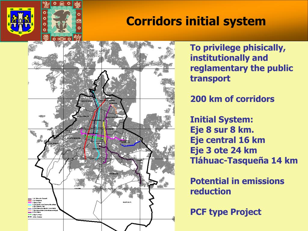 Corridors initial system To privilege phisically, institutionally and reglamentary the public transport 200 km of corridors Initial System: Eje 8 sur 8 km. Eje central 16 km Eje 3 ote 24 km Tláhuac-Tasqueña 14 km Potential in emissions reduction PCF type Project