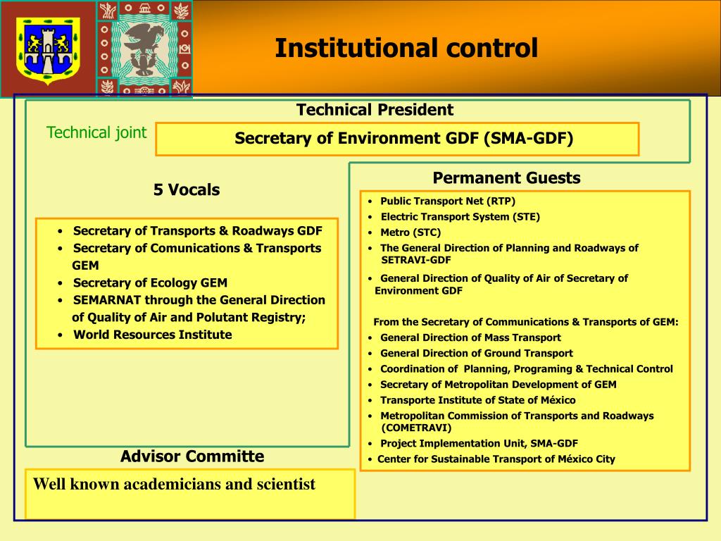 Institutional control Technical President Technical joint Secretary of Environment GDF (SMA-GDF) Permanent Guests 5 Vocals • Public Transport Net (RTP) • Electric Transport System (STE) • Metro (STC) • The General Direction of Planning and Roadways of SETRAVI-GDF • General Direction of Quality of Airof Secretary of Environment GDF • From the Secretary of Communications & Transports of GEM: • General Direction of Mass Transport • General Direction of Ground Transport • Coordination of Planning, Programing & Technical Control • Secretary of Metropolitan Development of GEM • Transporte Institute of State of México • Metropolitan Commission of Transports and Roadways (COMETRAVI) • Project Implementation Unit, SMA-GDF • Center for Sustainable Transport of México City • Secretary of Transports & Roadways GDF • Secretary of Comunications & Transports GEM • Secretary of Ecology GEM • SEMARNAT through the General Direction of Quality of Air and Polutant Registry; • World Resources Institute Advisor Committe Well known academicians and scientist