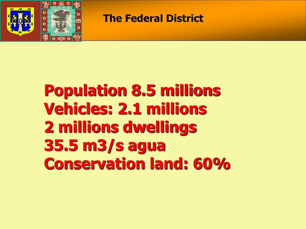 The Federal District Population 8.5 millions Vehicles: 2.1 millions 2 millions dwellings 35.5 m3/s agua Conservation land: 60%