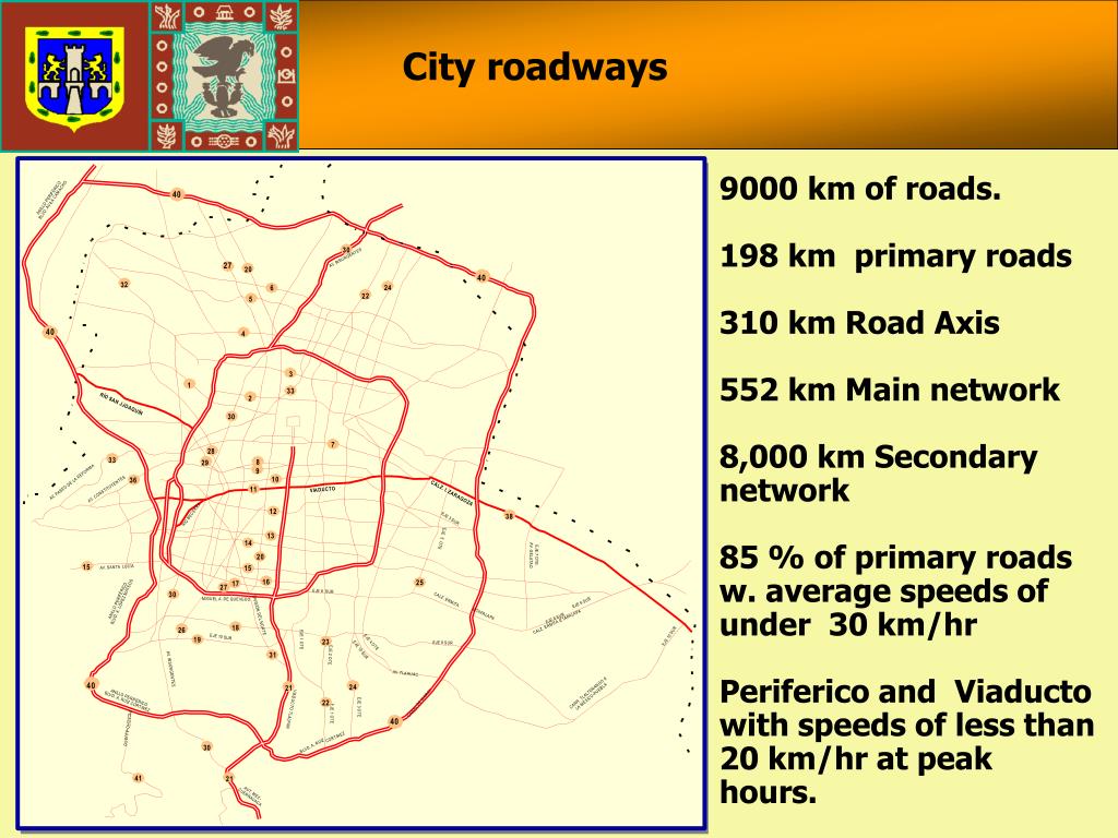 City roadways 9000 km of roads. 198 km primary roads 310 km Road Axis 552 km Main network 8,000 km Secondary network 85 % of primary roads w. average speeds of under 30 km/hr Periferico and Viaducto with speeds of less than 20 km/hr at peak hours.