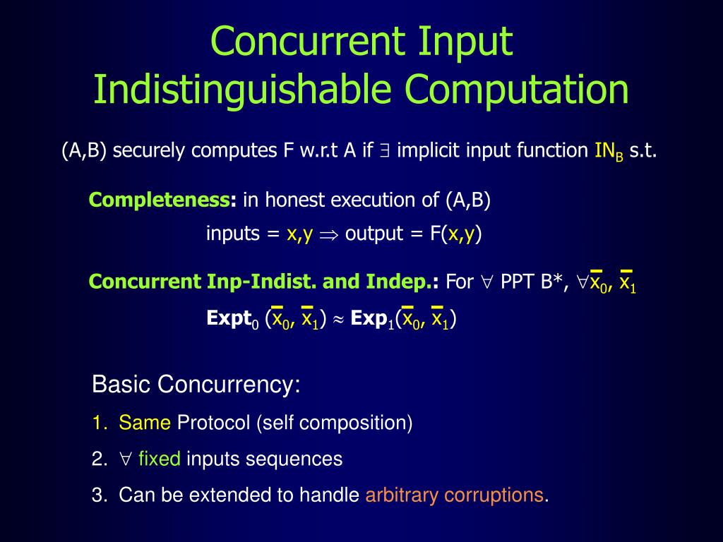 Concurrent Input Indistinguishable Computation (A,B) securely computes F w.r.t A if implicit input function INB s.t. Completeness: in honest execution of (A,B) inputs = x,y output = F(x,y) ConcurrentInp-Indist. and Indep.: For PPT B*, x0, x1 Expt0(x0, x1) Exp1(x0, x1) Basic Concurrency: • Same Protocol (self composition) • fixed inputs sequences • Can be extended to handle arbitrary corruptions.