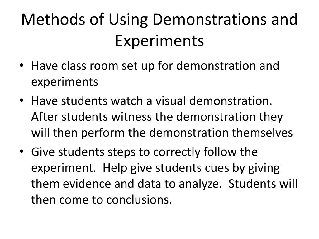 Methods of Using Demonstrations and Experiments • Have class room set up for demonstration and experiments • Have students watch a visual demonstration. After students witness the demonstration they will then perform the demonstration themselves • Give students steps to correctly follow the experiment. Help give students cues by giving them evidence and data to analyze. Students will then come to conclusions.