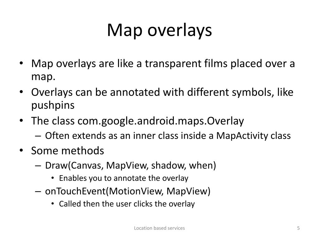 Map overlays • Map overlays are like a transparent films placed over a map. • Overlays can be annotated with different symbols, like pushpins • The class com.google.android.maps.Overlay • Often extends as an inner class inside a MapActivity class • Some methods • Draw(Canvas, MapView, shadow, when) • Enables you to annotate the overlay • onTouchEvent(MotionView, MapView) • Called then the user clicks the overlay Location based services