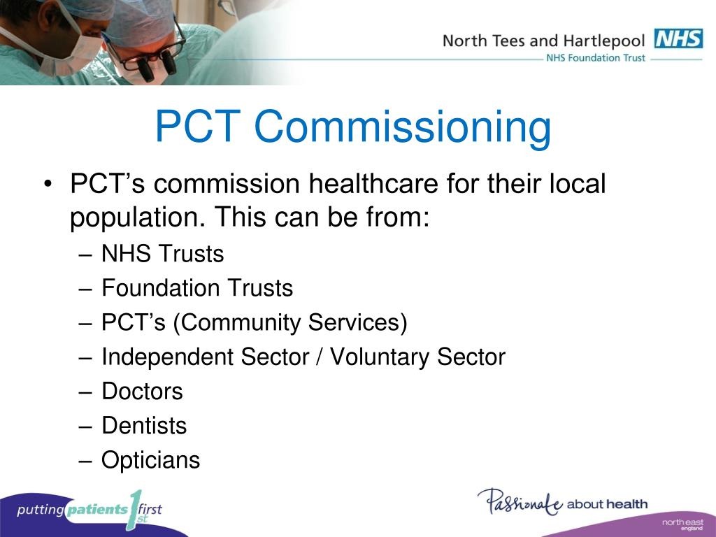 PCT Commissioning • PCT’s commission healthcare for their local population. This can be from: • NHS Trusts • Foundation Trusts • PCT’s (Community Services) • Independent Sector / Voluntary Sector • Doctors • Dentists • Opticians