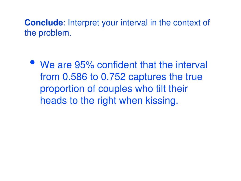 Conclude: Interpret your interval in the context of the problem. • We are 95% confident that the interval from 0.586 to 0.752 captures the true proportion of couples who tilt their heads to the right when kissing.