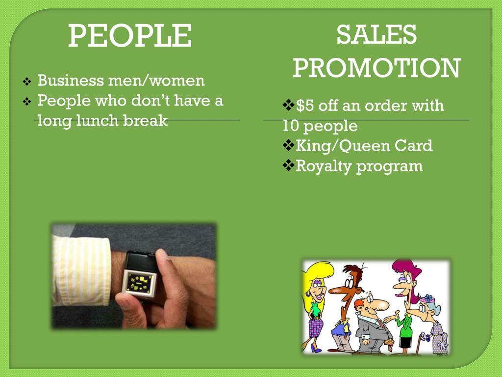 People Sales Promotion • $5 off an order with 10 people • King/Queen Card • Royalty program • Business men/women • People who don’t have a long lunch break