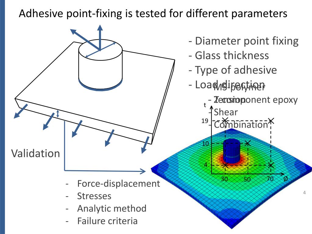 Adhesive point-fixing is tested for different parameters - Diameter point fixing - Glass thickness - Type of adhesive - Load direction - MS-polymer - 2-component epoxy - Tension - Shear - Combination Validation t 19 • Force-displacement • Stresses • Analytic method • Failure criteria 10 4 Ø 70 30 50