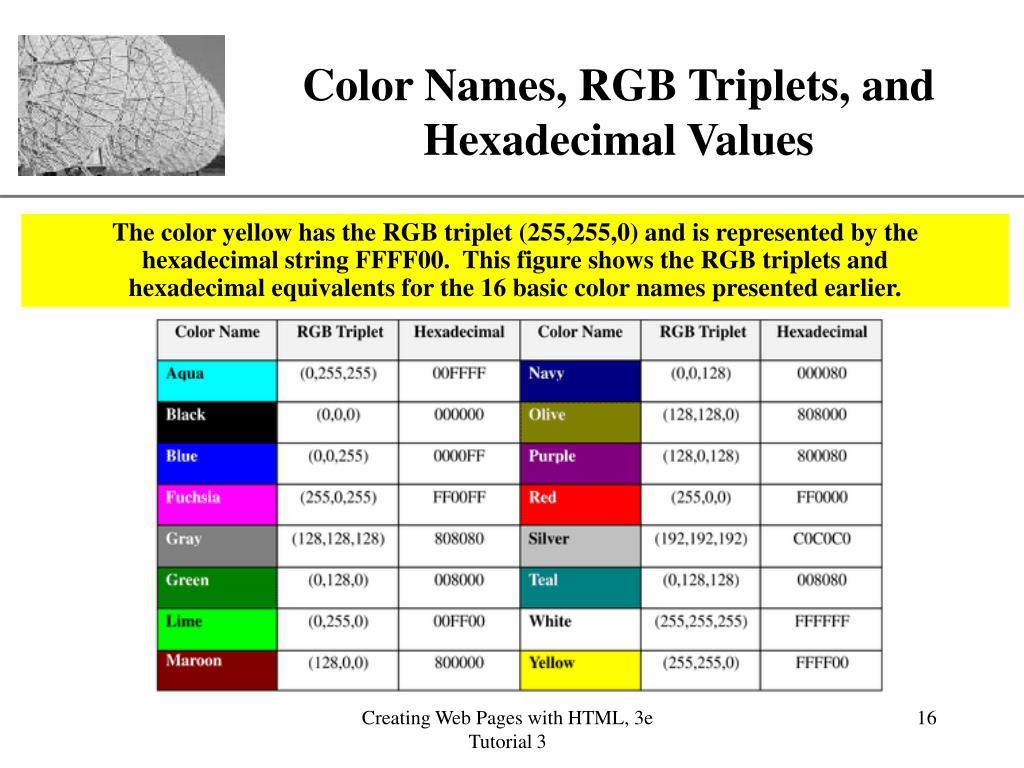 Color Names, RGB Triplets, and Hexadecimal Values The color yellow has the RGB triplet (255,255,0) and is represented by the hexadecimal string FFFF00. This figure shows the RGB triplets and hexadecimal equivalents for the 16 basic color names presented earlier. Creating Web Pages with HTML, 3e Tutorial 3