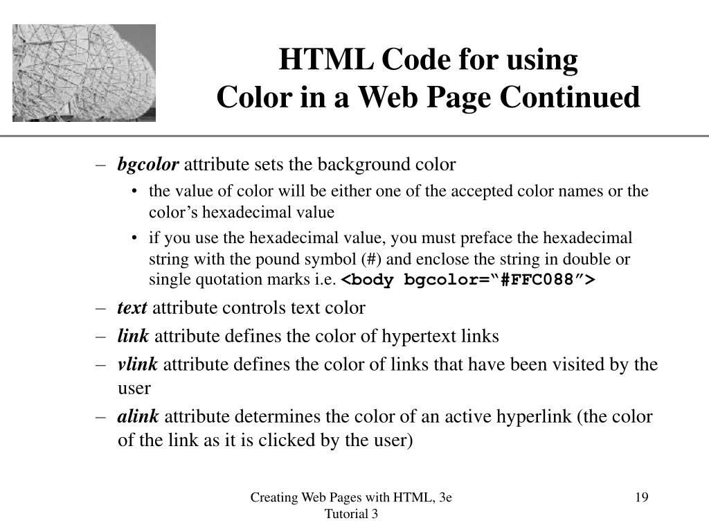 active hyperlink color previously followed hyperlink color text color hyperlink color background color HTML Code for using Color in a Web Page Continued Creating Web Pages with HTML, 3e Tutorial 3