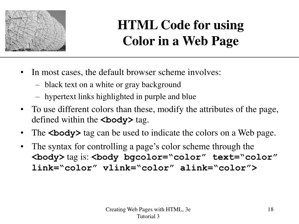 HTML Code for using Color in a Web Page • In most cases, the default browser scheme involves: • black text on a white or gray background • hypertext links highlighted in purple and blue • To use different colors than these, modify the attributes of the page, defined within the <body> tag. • The <body> tag can be used to indicate the colors on a Web page. • The syntax for controlling a page’s color scheme through the <body> tag is: <body bgcolor=“color” text=“color” link=“color” vlink=“color” alink=“color”> Creating Web Pages with HTML, 3e Tutorial 3