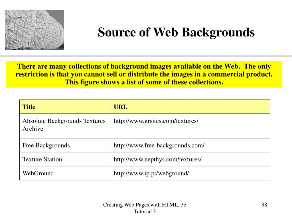 Title URL Absolute Backgrounds Textures Archive http://www.grsites.com/textures/ Free Backgrounds http://www.free-backgrounds.com/ Texture Station http://www.nepthys.com/textures/ WebGround http://www.ip.pt/webground/ Source of Web Backgrounds There are many collections of background images available on the Web. The only restriction is that you cannot sell or distribute the images in a commercial product. This figure shows a list of some of these collections. Creating Web Pages with HTML, 3e Tutorial 3