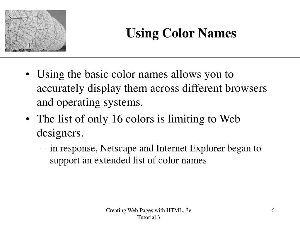 Using Color Names • Using the basic color names allows you to accurately display them across different browsers and operating systems. • The list of only 16 colors is limiting to Web designers. • in response, Netscape and Internet Explorer began to support an extended list of color names Creating Web Pages with HTML, 3e Tutorial 3