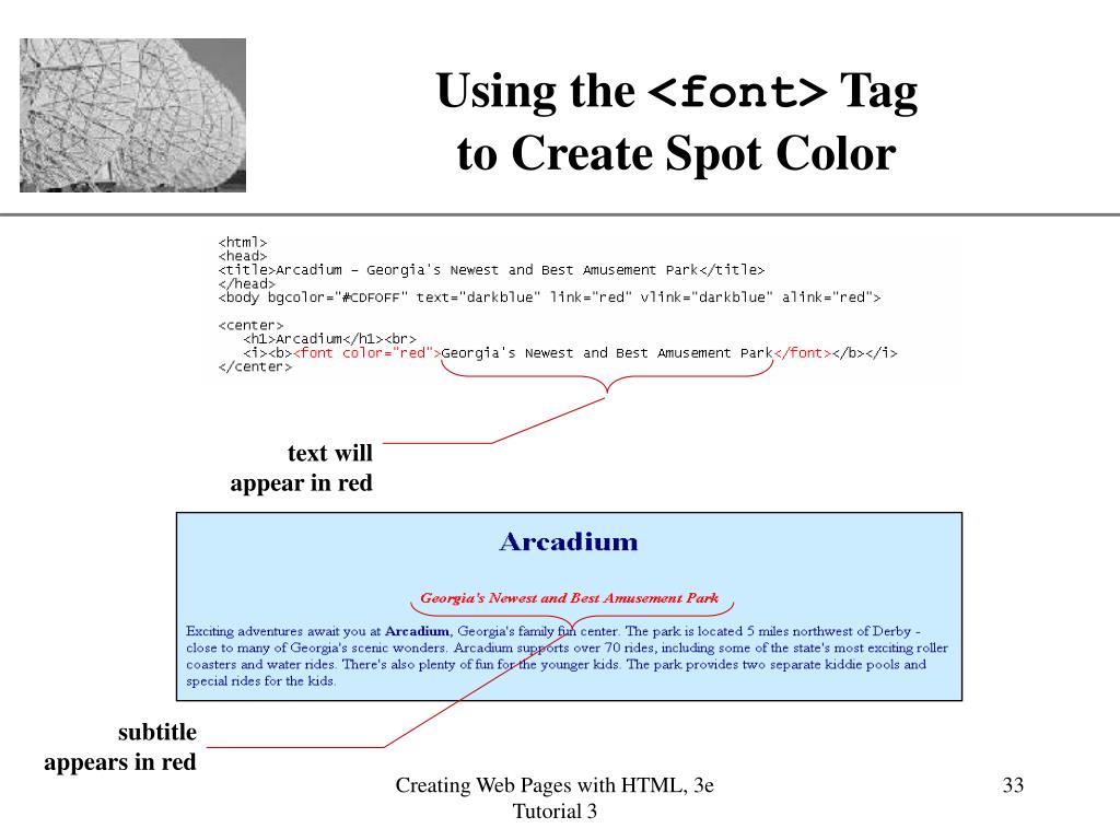 text will appear in red subtitle appears in red Using the <font> Tag to Create Spot Color Creating Web Pages with HTML, 3e Tutorial 3