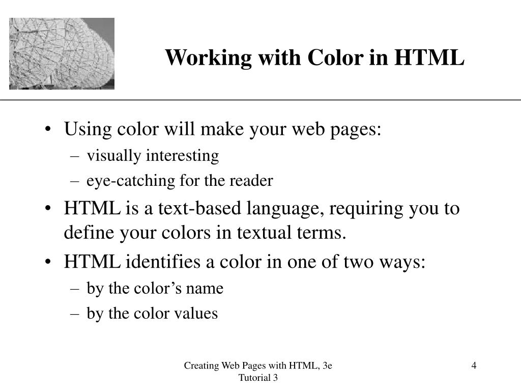Working with Color in HTML • Using color will make your web pages: • visually interesting • eye-catching for the reader • HTML is a text-based language, requiring you to define your colors in textual terms. • HTML identifies a color in one of two ways: • by the color’s name • by the color values Creating Web Pages with HTML, 3e Tutorial 3