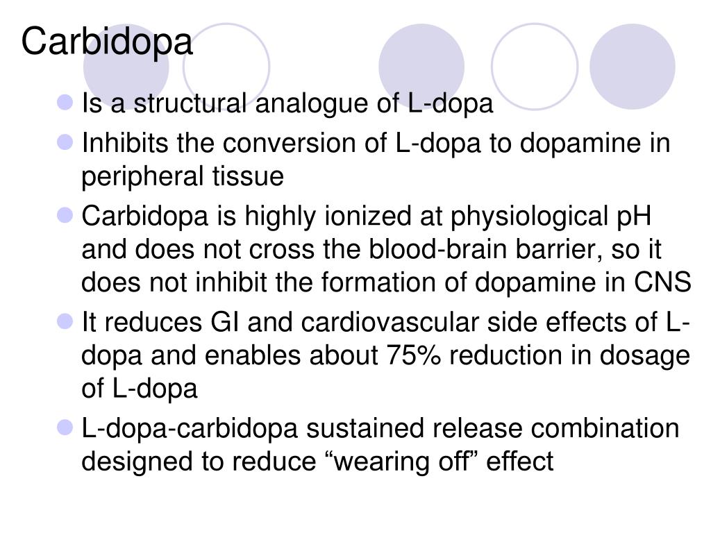 Carbidopa • Is a structural analogue of L-dopa • Inhibits the conversion of L-dopa to dopamine in peripheral tissue • Carbidopa is highly ionized at physiological pH and does not cross the blood-brain barrier, so it does not inhibit the formation of dopamine in CNS • It reduces GI and cardiovascular side effects of L-dopa and enables about 75% reduction in dosage of L-dopa • L-dopa-carbidopa sustained release combination designed to reduce “wearing off” effect