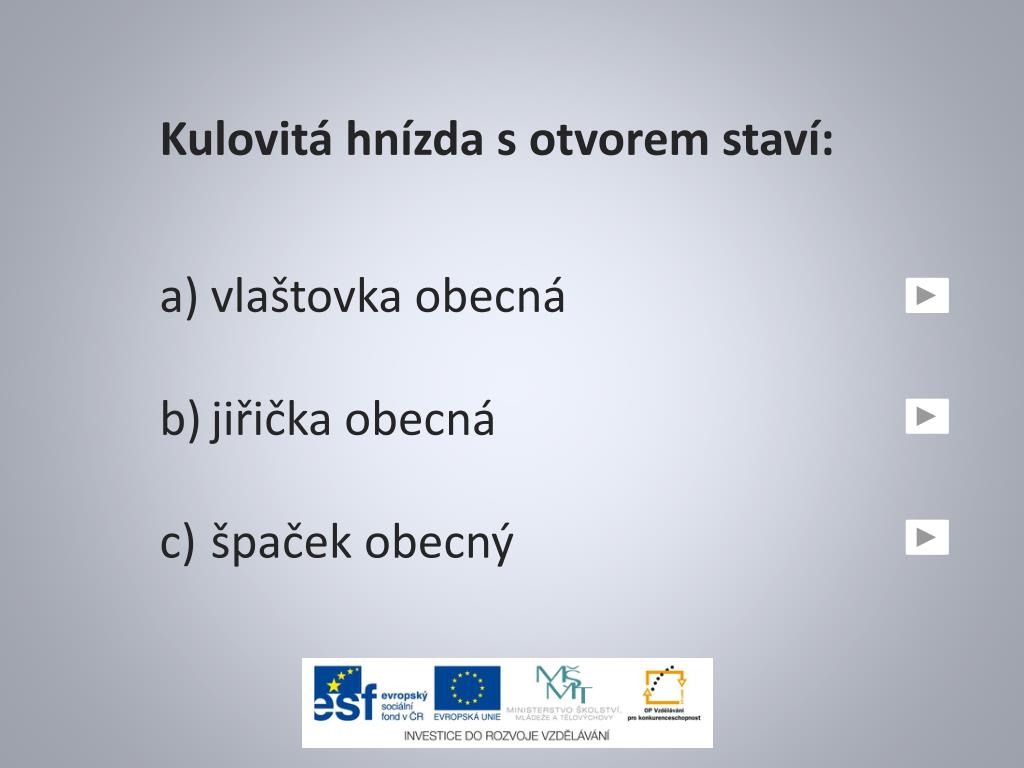 Kulovitá hnízda s otvorem staví: vlaštovka obecná jiřička obecná špaček obecný