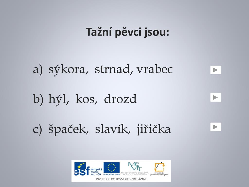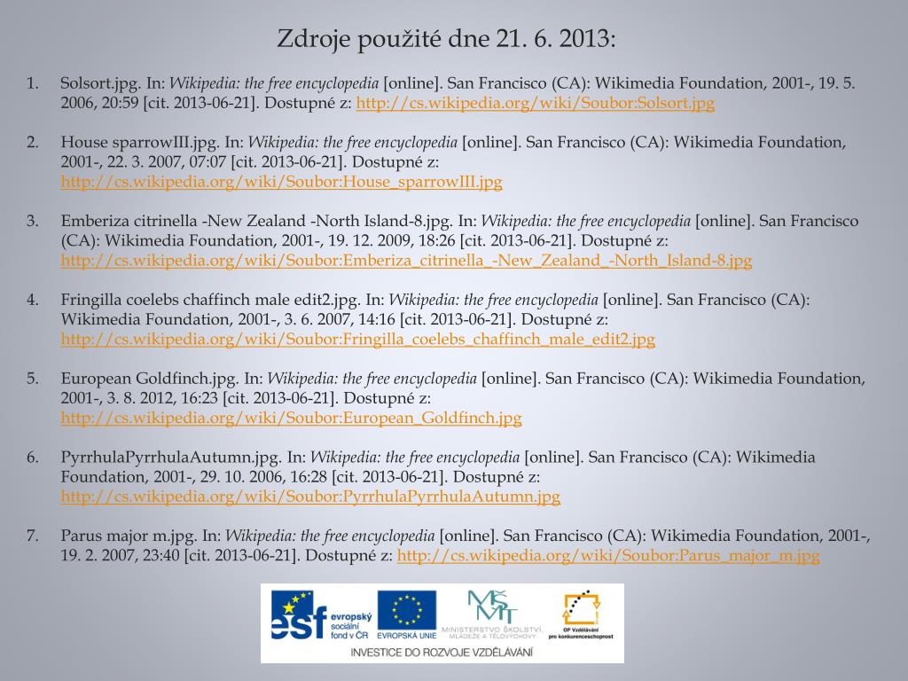 Zdroje použité dne 21. 6. 2013: Solsort.jpg. In: Wikipedia: the free encyclopedia [online]. San Francisco (CA): WikimediaFoundation, 2001-, 19. 5. 2006, 20:59 [cit. 2013-06-21]. Dostupné z: http://cs.wikipedia.org/wiki/Soubor:Solsort.jpg House sparrowIII.jpg. In: Wikipedia: the free encyclopedia [online]. San Francisco (CA): WikimediaFoundation, 2001-, 22. 3. 2007, 07:07 [cit. 2013-06-21]. Dostupné z: http://cs.wikipedia.org/wiki/Soubor:House_sparrowIII.jpg Emberizacitrinella -New Zealand -North Island-8.jpg. In: Wikipedia: the free encyclopedia [online]. San Francisco (CA): WikimediaFoundation, 2001-, 19. 12. 2009, 18:26 [cit. 2013-06-21]. Dostupné z: http://cs.wikipedia.org/wiki/Soubor:Emberiza_citrinella_-New_Zealand_-North_Island-8.jpg Fringillacoelebschaffinch male edit2.jpg. In: Wikipedia: the free encyclopedia [online]. San Francisco (CA): WikimediaFoundation, 2001-, 3. 6. 2007, 14:16 [cit. 2013-06-21]. Dostupné z: http://cs.wikipedia.org/wiki/Soubor:Fringilla_coelebs_chaffinch_male_edit2.jpg EuropeanGoldfinch.jpg. In: Wikipedia: the free encyclopedia [online]. San Francisco (CA): WikimediaFoundation, 2001-, 3. 8. 2012, 16:23 [cit. 2013-06-21]. Dostupné z: http://cs.wikipedia.org/wiki/Soubor:European_Goldfinch.jpg PyrrhulaPyrrhulaAutumn.jpg. In: Wikipedia: the free encyclopedia [online]. San Francisco (CA): WikimediaFoundation, 2001-, 29. 10. 2006, 16:28 [cit. 2013-06-21]. Dostupné z: http://cs.wikipedia.org/wiki/Soubor:PyrrhulaPyrrhulaAutumn.jpg Parus major m.jpg. In: Wikipedia: the free encyclopedia [online]. San Francisco (CA): WikimediaFoundation, 2001-, 19. 2. 2007, 23:40 [cit. 2013-06-21]. Dostupné z: http://cs.wikipedia.org/wiki/Soubor:Parus_major_m.jpg