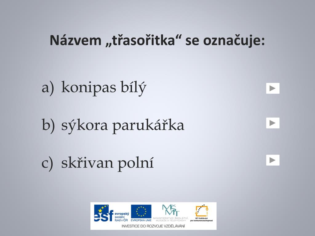 Názvem „třasořitka“ se označuje: konipas bílý sýkora parukářka skřivan polní