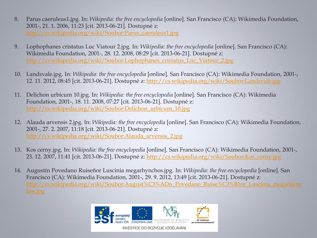 Parus caeruleus1.jpg. In: Wikipedia: the free encyclopedia [online]. San Francisco (CA): WikimediaFoundation, 2001-, 21. 1. 2006, 11:23 [cit. 2013-06-21]. Dostupné z: http://cs.wikipedia.org/wiki/Soubor:Parus_caeruleus1.jpg LophophanescristatusLucViatour 2.jpg. In: Wikipedia: the free encyclopedia [online]. San Francisco (CA): WikimediaFoundation, 2001-, 28. 12. 2008, 08:29 [cit. 2013-06-21]. Dostupné z: http://cs.wikipedia.org/wiki/Soubor:Lophophanes_cristatus_Luc_Viatour_2.jpg Landsvale.jpg. In: Wikipedia: the free encyclopedia [online]. San Francisco (CA): WikimediaFoundation, 2001-, 12. 11. 2012, 08:45 [cit. 2013-06-21]. Dostupné z: http://cs.wikipedia.org/wiki/Soubor:Landsvale.jpg Delichonurbicum 10.jpg. In: Wikipedia: the free encyclopedia [online]. San Francisco (CA): WikimediaFoundation, 2001-, 18. 11. 2008, 07:27 [cit. 2013-06-21]. Dostupné z: http://cs.wikipedia.org/wiki/Soubor:Delichon_urbicum_10.jpg Alaudaarvensis 2.jpg. In: Wikipedia: the free encyclopedia [online]. San Francisco (CA): WikimediaFoundation, 2001-, 27. 2. 2007, 11:18 [cit. 2013-06-21]. Dostupné z: http://cs.wikipedia.org/wiki/Soubor:Alauda_arvensis_2.jpg Kos cerny.jpg. In: Wikipedia: the free encyclopedia [online]. San Francisco (CA): WikimediaFoundation, 2001-, 23. 12. 2007, 11:41 [cit. 2013-06-21]. Dostupné z: http://cs.wikipedia.org/wiki/Soubor:Kos_cerny.jpg AugustínPovedanoRuiseñorLusciniamegarhynchos.jpg. In: Wikipedia: the free encyclopedia [online]. San Francisco (CA): WikimediaFoundation, 2001-, 29. 9. 2012, 13:49 [cit. 2013-06-21]. Dostupné z: http://cs.wikipedia.org/wiki/Soubor:August%C3%ADn_Povedano_Ruise%C3%B1or_Luscinia_megarhynchos.jpg
