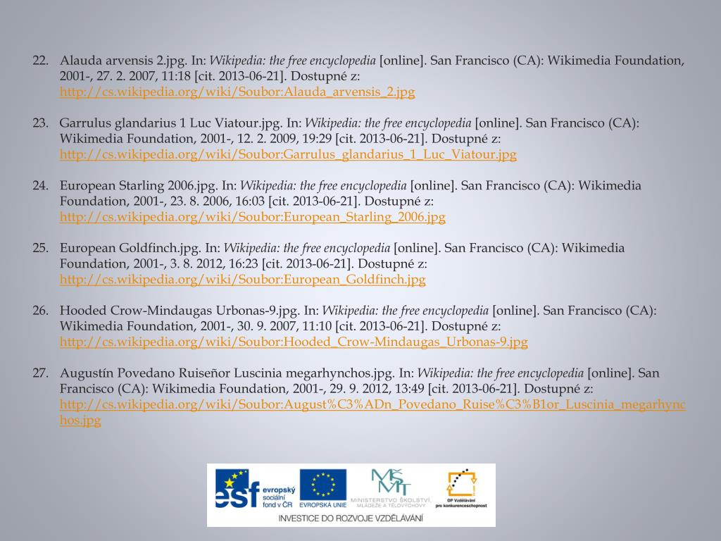 Alaudaarvensis 2.jpg. In: Wikipedia: the free encyclopedia [online]. San Francisco (CA): WikimediaFoundation, 2001-, 27. 2. 2007, 11:18 [cit. 2013-06-21]. Dostupné z: http://cs.wikipedia.org/wiki/Soubor:Alauda_arvensis_2.jpg Garrulusglandarius 1 LucViatour.jpg. In: Wikipedia: the free encyclopedia [online]. San Francisco (CA): WikimediaFoundation, 2001-, 12. 2. 2009, 19:29 [cit. 2013-06-21]. Dostupné z: http://cs.wikipedia.org/wiki/Soubor:Garrulus_glandarius_1_Luc_Viatour.jpg EuropeanStarling 2006.jpg. In: Wikipedia: the free encyclopedia [online]. San Francisco (CA): WikimediaFoundation, 2001-, 23. 8. 2006, 16:03 [cit. 2013-06-21]. Dostupné z: http://cs.wikipedia.org/wiki/Soubor:European_Starling_2006.jpg EuropeanGoldfinch.jpg. In: Wikipedia: the free encyclopedia [online]. San Francisco (CA): WikimediaFoundation, 2001-, 3. 8. 2012, 16:23 [cit. 2013-06-21]. Dostupné z: http://cs.wikipedia.org/wiki/Soubor:European_Goldfinch.jpg HoodedCrow-MindaugasUrbonas-9.jpg. In: Wikipedia: the free encyclopedia [online]. San Francisco (CA): WikimediaFoundation, 2001-, 30. 9. 2007, 11:10 [cit. 2013-06-21]. Dostupné z: http://cs.wikipedia.org/wiki/Soubor:Hooded_Crow-Mindaugas_Urbonas-9.jpg AugustínPovedanoRuiseñorLusciniamegarhynchos.jpg. In: Wikipedia: the free encyclopedia [online]. San Francisco (CA): WikimediaFoundation, 2001-, 29. 9. 2012, 13:49 [cit. 2013-06-21]. Dostupné z: http://cs.wikipedia.org/wiki/Soubor:August%C3%ADn_Povedano_Ruise%C3%B1or_Luscinia_megarhynchos.jpg