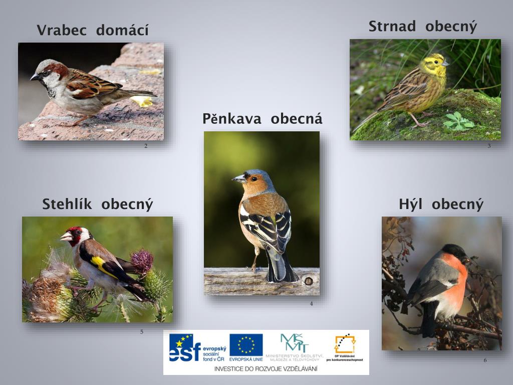 Strnad obecný Vrabec domácí Pěnkava obecná 2 3 Stehlík obecný Hýl obecný 4 5 6