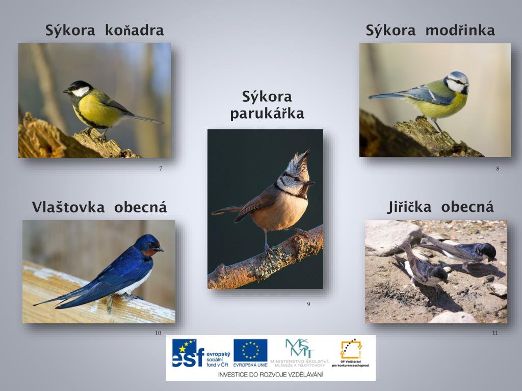 Sýkora koňadra Sýkora modřinka Sýkora parukářka 7 8 Vlaštovka obecná Jiřička obecná 9 10 11