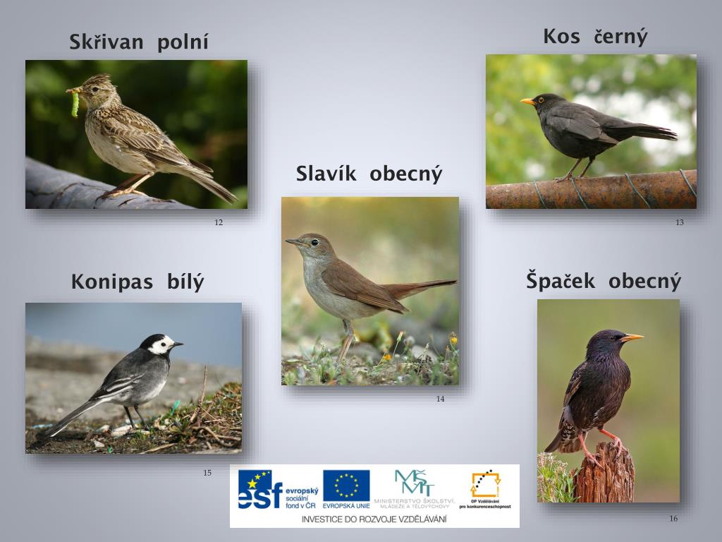 Kos černý Skřivan polní Slavík obecný 12 13 Konipas bílý Špaček obecný 14 15 16