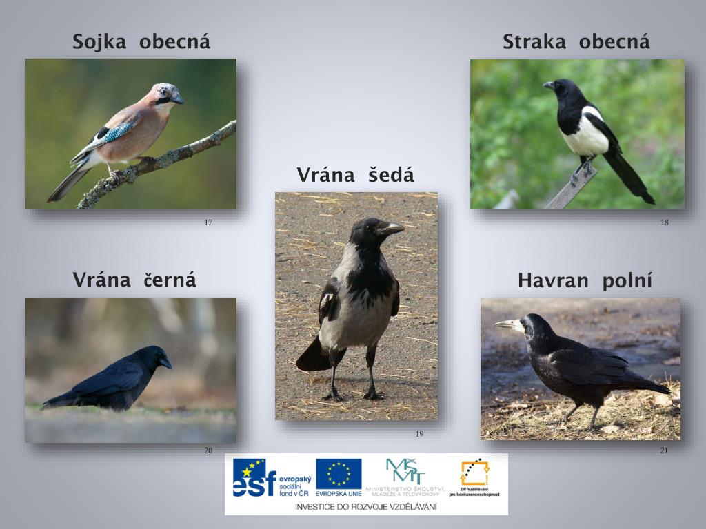 Sojka obecná Straka obecná Vrána šedá 17 18 Vrána černá Havran polní 19 20 21