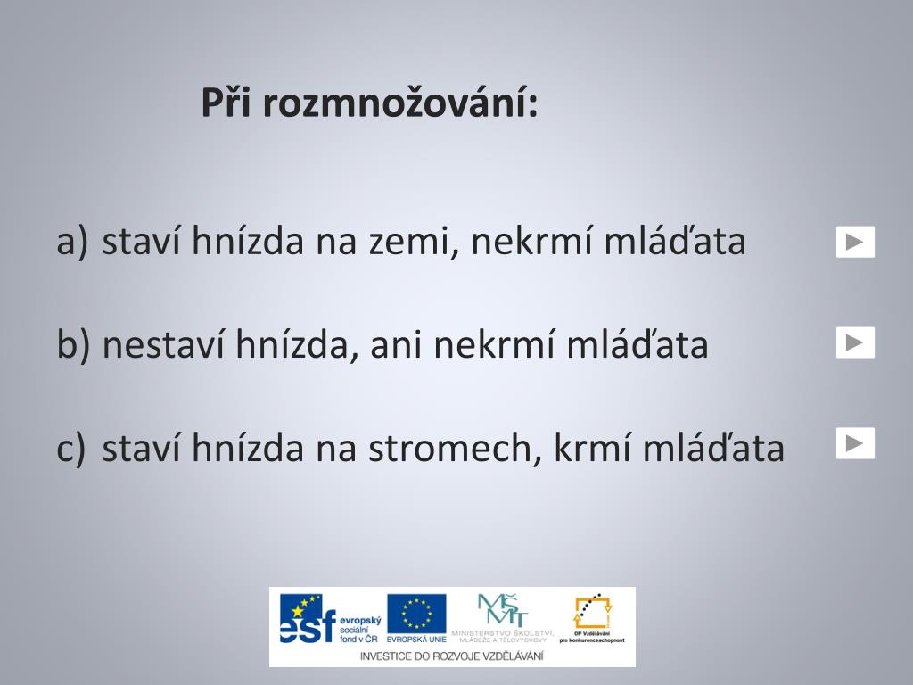Při rozmnožování: staví hnízda na zemi, nekrmí mláďata nestaví hnízda, ani nekrmí mláďata staví hnízda na stromech, krmí mláďata