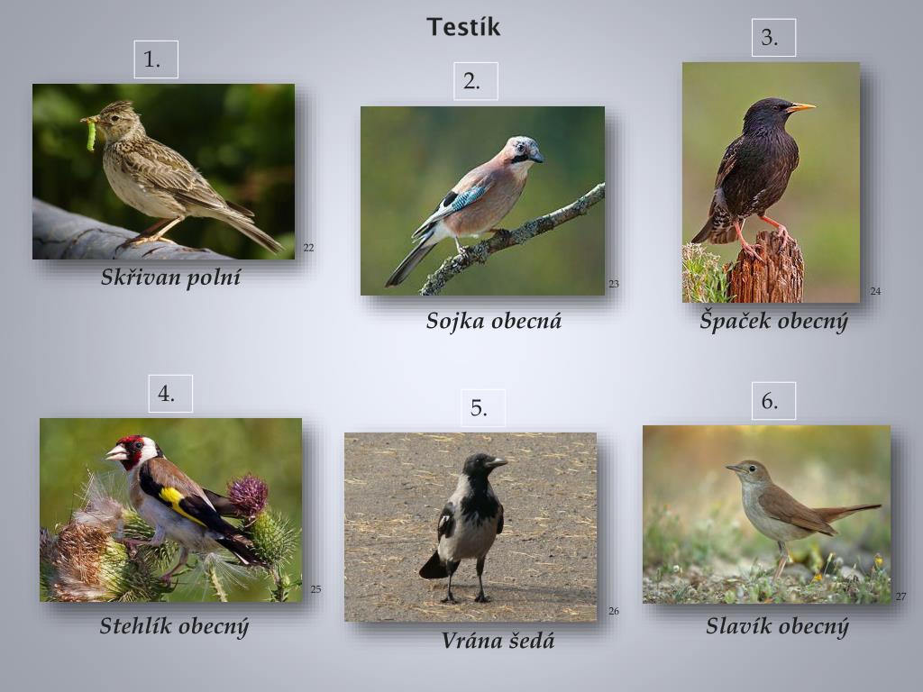3. Testík 1. 2. 22 Skřivan polní 23 24 Sojka obecná Špaček obecný 4. 6. 5. 25 27 26 Stehlík obecný Slavík obecný Vrána šedá