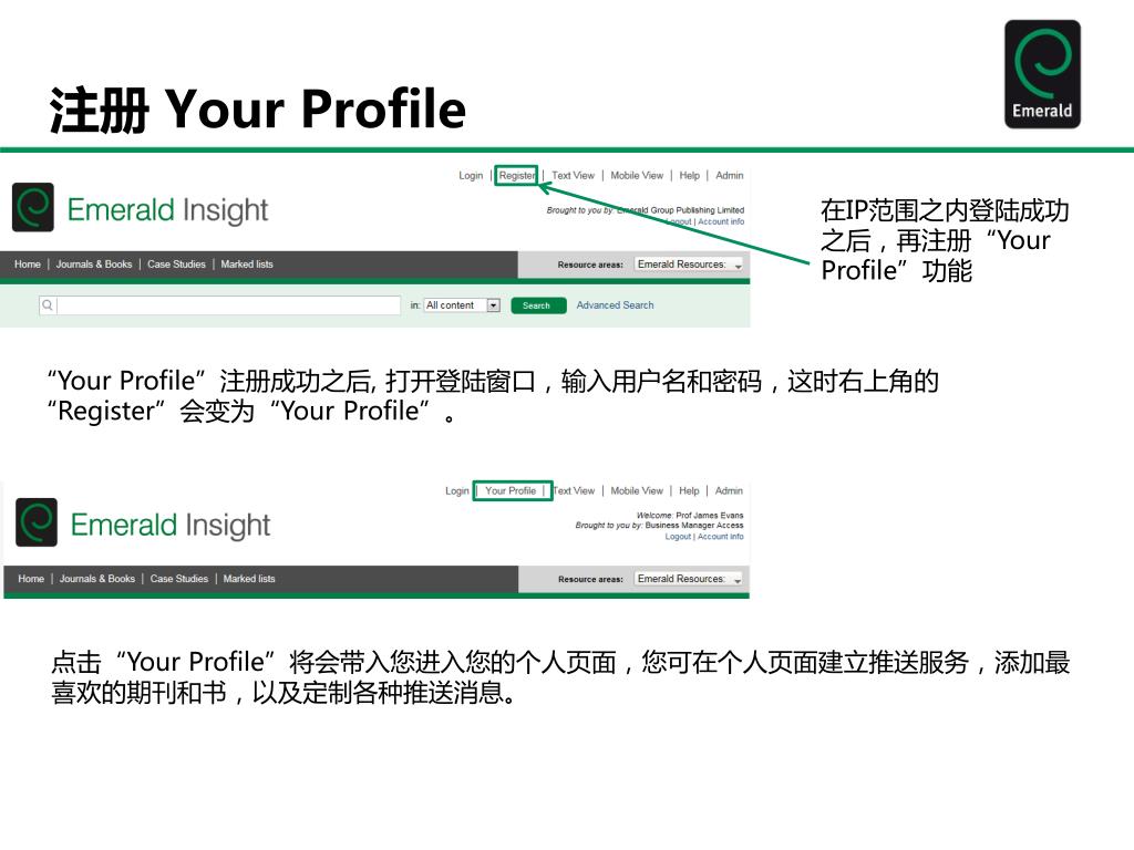 注册 Your Profile 在IP范围之内登陆成功之后,再注册“Your Profile”功能 “Your Profile”注册成功之后, 打开登陆窗口,输入用户名和密码,这时右上角的“Register”会变为“Your Profile”。 点击“Your Profile”将会带入您进入您的个人页面,您可在个人页面建立推送服务,添加最喜欢的期刊和书,以及定制各种推送消息。