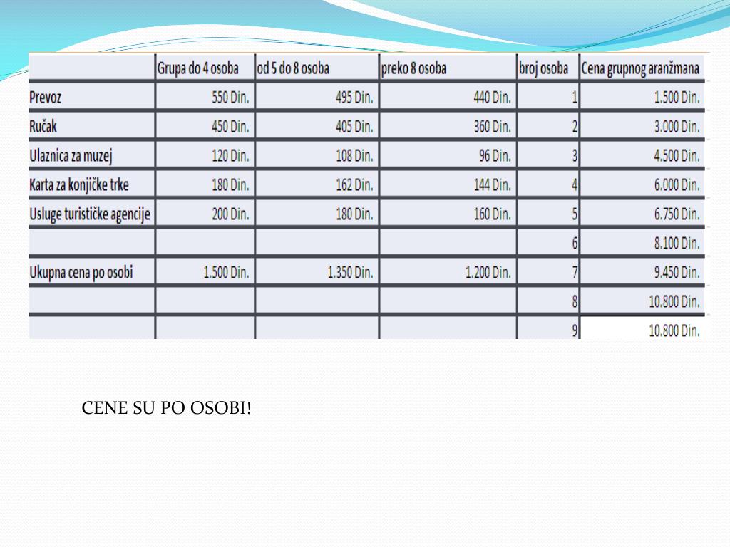 CENOVNIK • Ukupna cena izleta iznosi 1500 dinara po osobi • Aranžman uključuje: • Prevoz autobusom • Ručak u lovačkom restoranu • Ulaznica za muzej • Karta za konjičke trke • Napomena: • Vožnja fijakerom nije uračunata u cenu.