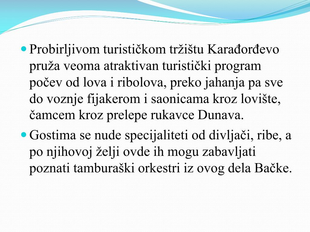 Probirljivom turističkom tržištu Karađorđevo pruža veoma atraktivan turistički program počev od lova i ribolova, preko jahanja pa sve do voznje fijakerom i saonicama kroz lovište, čamcem kroz prelepe rukavce Dunava. • Gostima se nude specijaliteti od divljači, ribe, a po njihovoj želji ovde ih mogu zabavljati poznati tamburaški orkestri iz ovog dela Bačke.