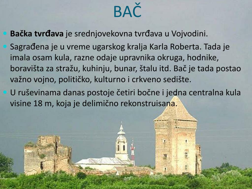 BAČ • Bačkatvrđavaje srednjovekovna tvrđavauVojvodini. • Sagrađenajeuvremeugarskog kraljaKarla Roberta. Tada jeimalaosamkula, razneodajeupravnikaokruga, hodnike, boravištazastražu, kuhinju, bunar, štaluitd. Bačjetadapostaovažnovojno, političko, kulturnoicrkvenosedište. • Uruševinamadanaspostoječetiribočneijednacentralnakulavisine 18 m, kojajedelimičnorekonstruisana.