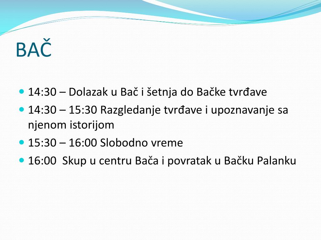 BAČ • 14:30 – Dolazak u Bač i šetnja do Bačke tvrđave • 14:30 – 15:30 Razgledanje tvrđave i upoznavanje sa njenom istorijom • 15:30 – 16:00 Slobodno vreme • 16:00 Skup u centru Bača i povratak u Bačku Palanku