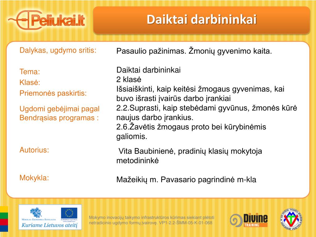 Daiktai darbininkai Dalykas, ugdymo sritis: Tema: Klasė: Priemonės paskirtis: Ugdomi gebėjimai pagal Bendrąsias programas : Autorius: Mokykla: Pasaulio pažinimas. Žmonių gyvenimo kaita. Daiktai darbininkai 2klasė Išsiaiškinti, kaip keitėsi žmogaus gyvenimas, kai buvo išrasti įvairūs darbo įrankiai 2.2.Suprasti, kaip stebėdami gyvūnus, žmonės kūrė naujus darbo įrankius. 2.6.Žavėtis žmogaus proto bei kūrybinėmis galiomis. Vita Baubinienė, pradinių klasių mokytoja metodininkė Mažeikių m. Pavasario pagrindinė m-kla