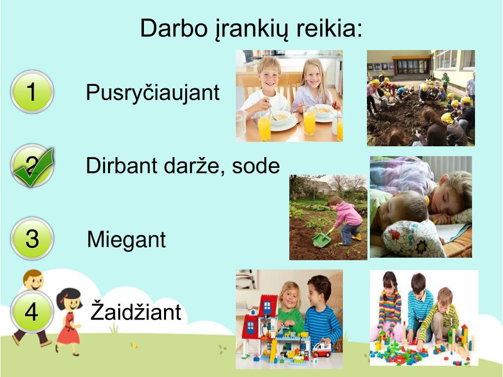 Darbo įrankių reikia: Pusryčiaujant Dirbant darže, sode Miegant Žaidžiant