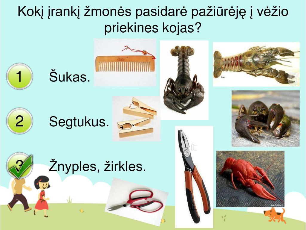 Kokį įrankį žmonės pasidarė pažiūrėję į vėžio priekines kojas? Šukas. Segtukus. Žnyples, žirkles.