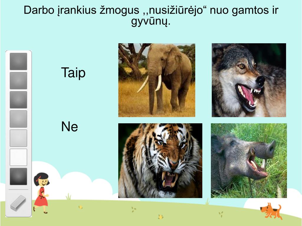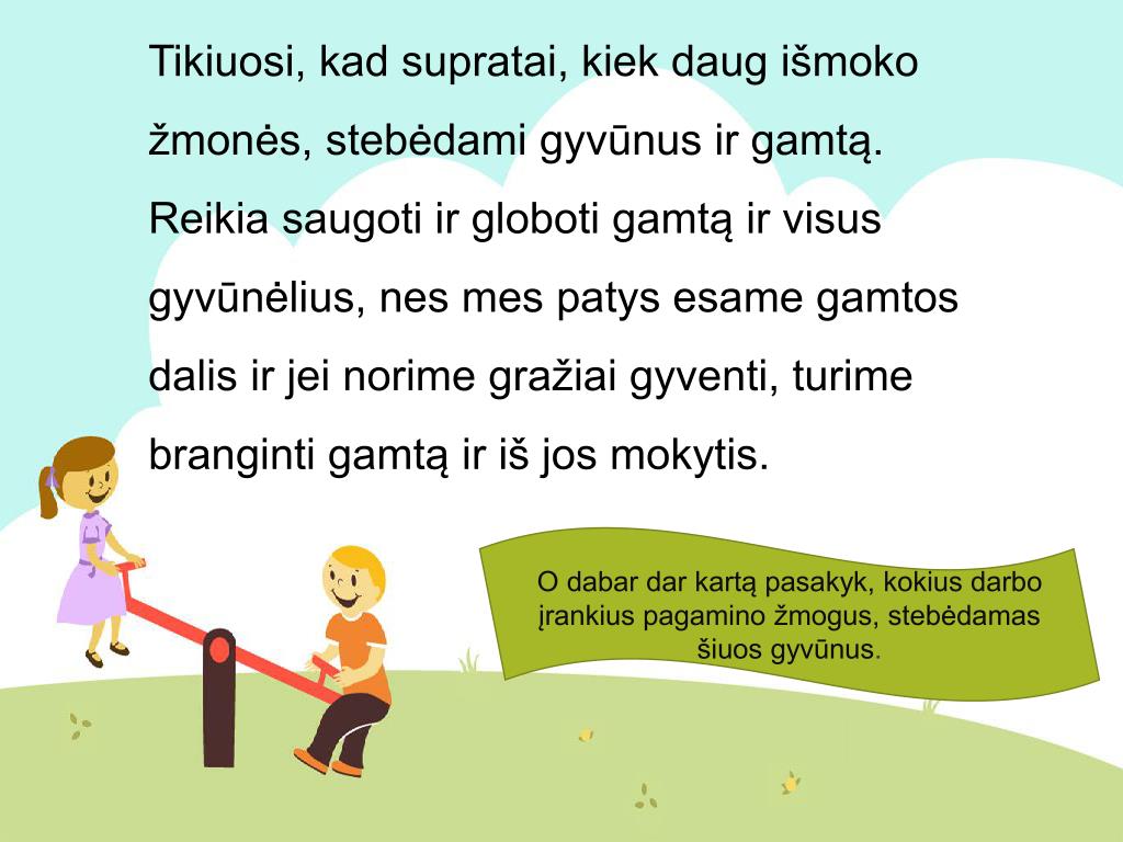 Tikiuosi, kad supratai, kiek daug išmoko žmonės, stebėdami gyvūnus ir gamtą. Reikia saugoti ir globoti gamtą ir visus gyvūnėlius, nes mes patys esame gamtos dalis ir jei norime gražiai gyventi, turime branginti gamtą ir iš jos mokytis. O dabar dar kartą pasakyk, kokius darbo įrankius pagamino žmogus, stebėdamas šiuos gyvūnus.
