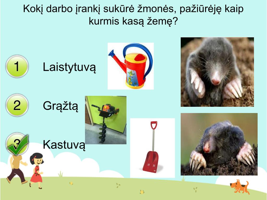 Kokį darbo įrankį sukūrė žmonės, pažiūrėję kaip kurmis kasą žemę? Laistytuvą Grąžtą Kastuvą