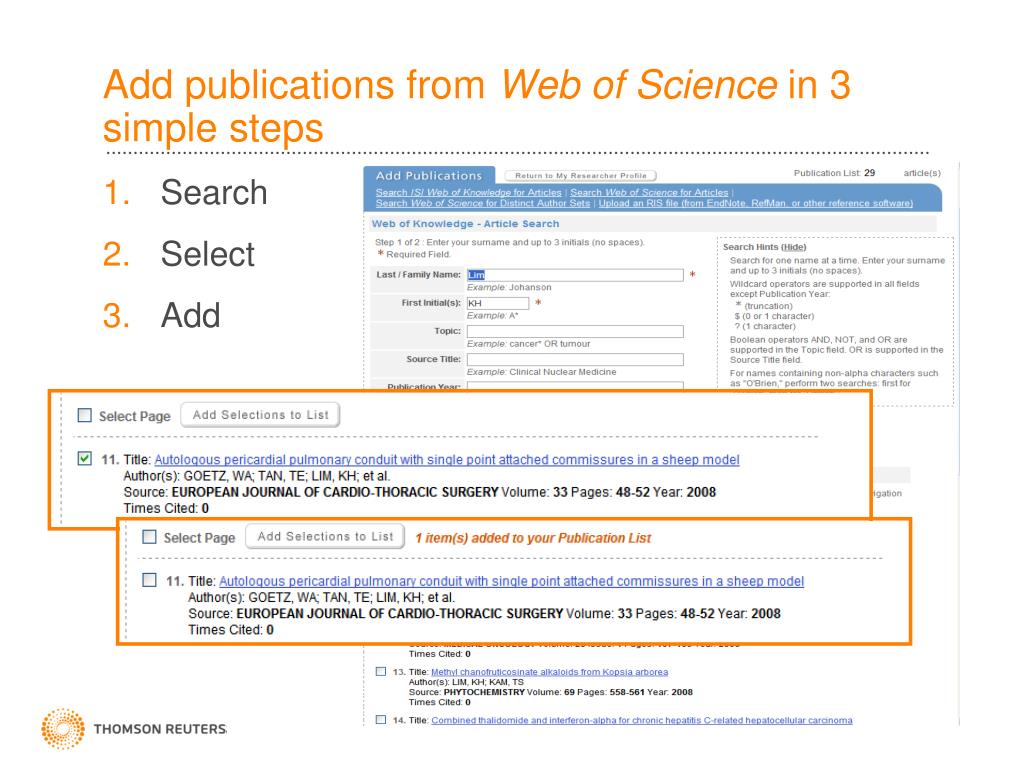 Add publications from Web of Science in 3 simple steps • Search • Select • Add