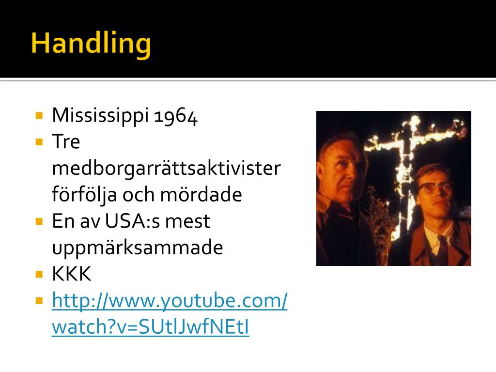 Handling • Mississippi 1964 • Tre medborgarrättsaktivister förfölja och mördade • En av USA:s mest uppmärksammade • KKK • http://www.youtube.com/watch?v=SUtlJwfNEtI